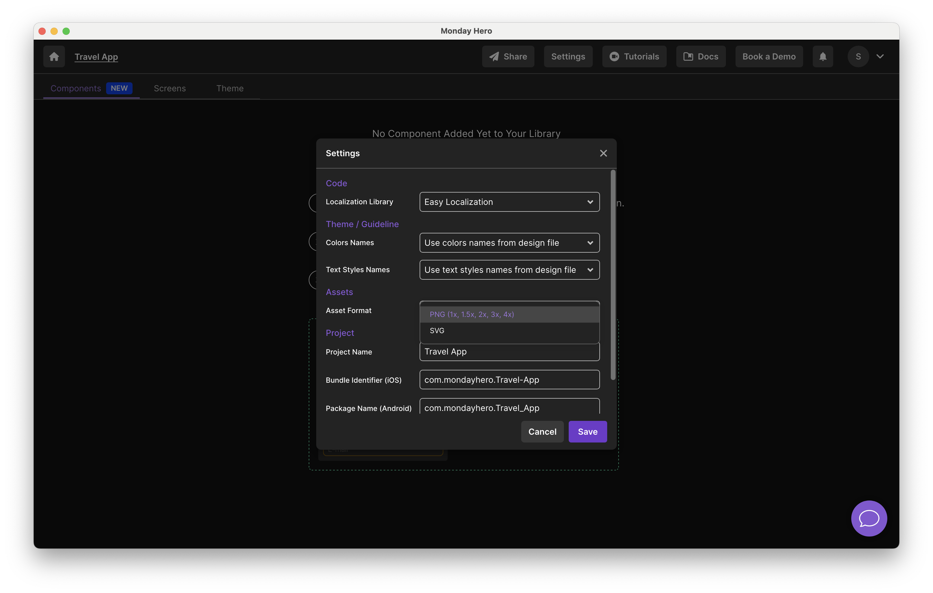 You can export assets to your Monday Hero project as PNG (1x, 1.5x, 2x, 3x, 4x) and/or SVG, depending on your needs. To change the asset format in your project, go to the Settings Screen.