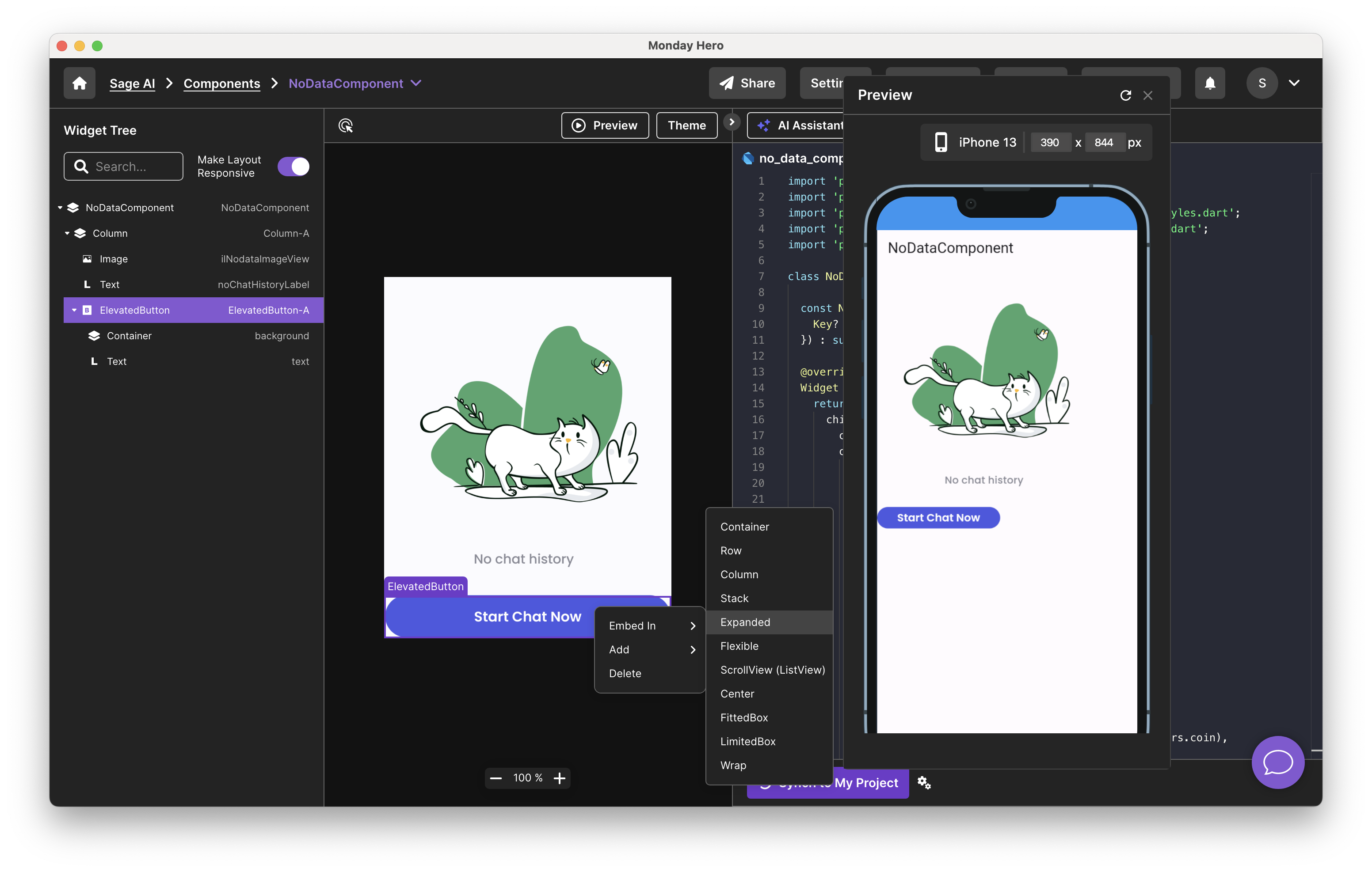 **Solution:** Once you preview the code result and the layout doesn't become responsive the way you'd like, please right-click and edit the rows, columns, and stacks to achieve the desired result. For more information on Monday Hero how to create and edit them, please refer to [our documentation.](https://learn.mondayhero.io/design-to-flutter/create-responsive-code)