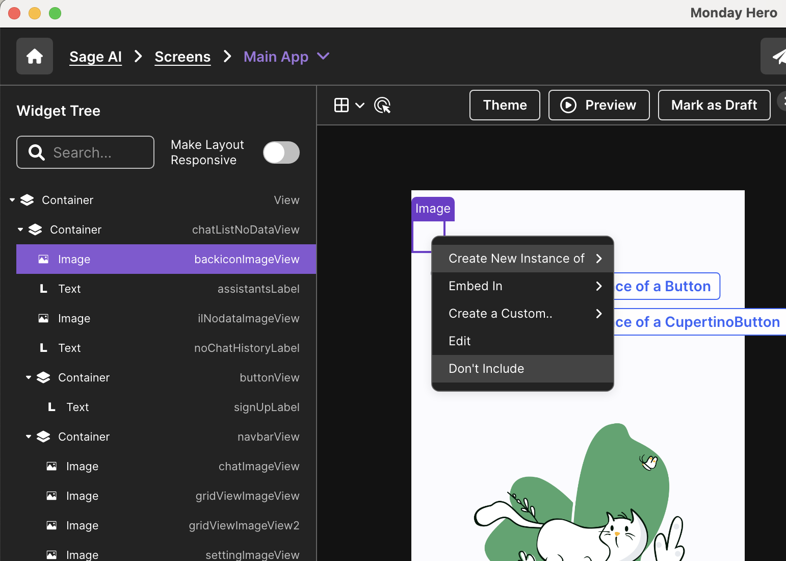 **Problem:** In the example below, the cat image consists of too many layers, as seen in the gif below. Having too many layers means Monday Hero will generate separate code for each layer in the widget. Since we only want one image code for one image, we need to group the layers to treat them as a single image.