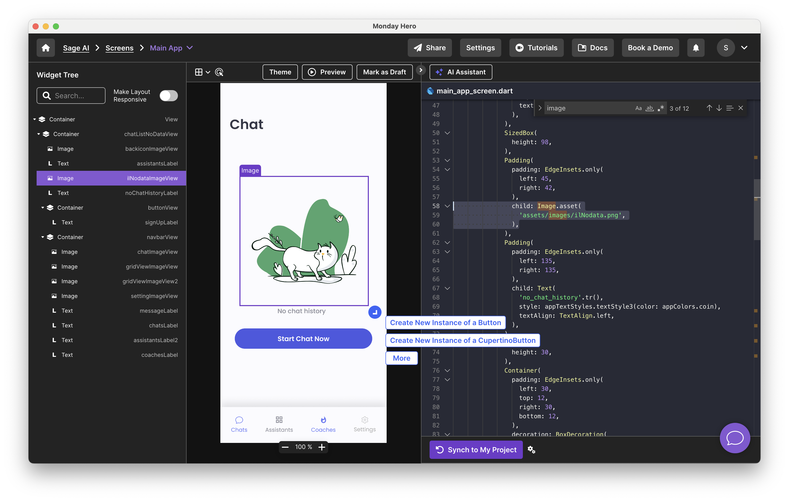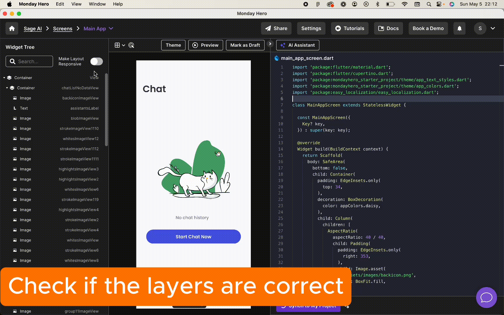Start the checklist by clicking on elements on the widget tree. Once you click on the layer, it will be highlighted on the screen image. Every layer in the widget tree will generate a code for the layer. While Monday Hero typically removes unnecessary layers, you might need to manually remove some to ensure accurate code generation while checking the checklist.