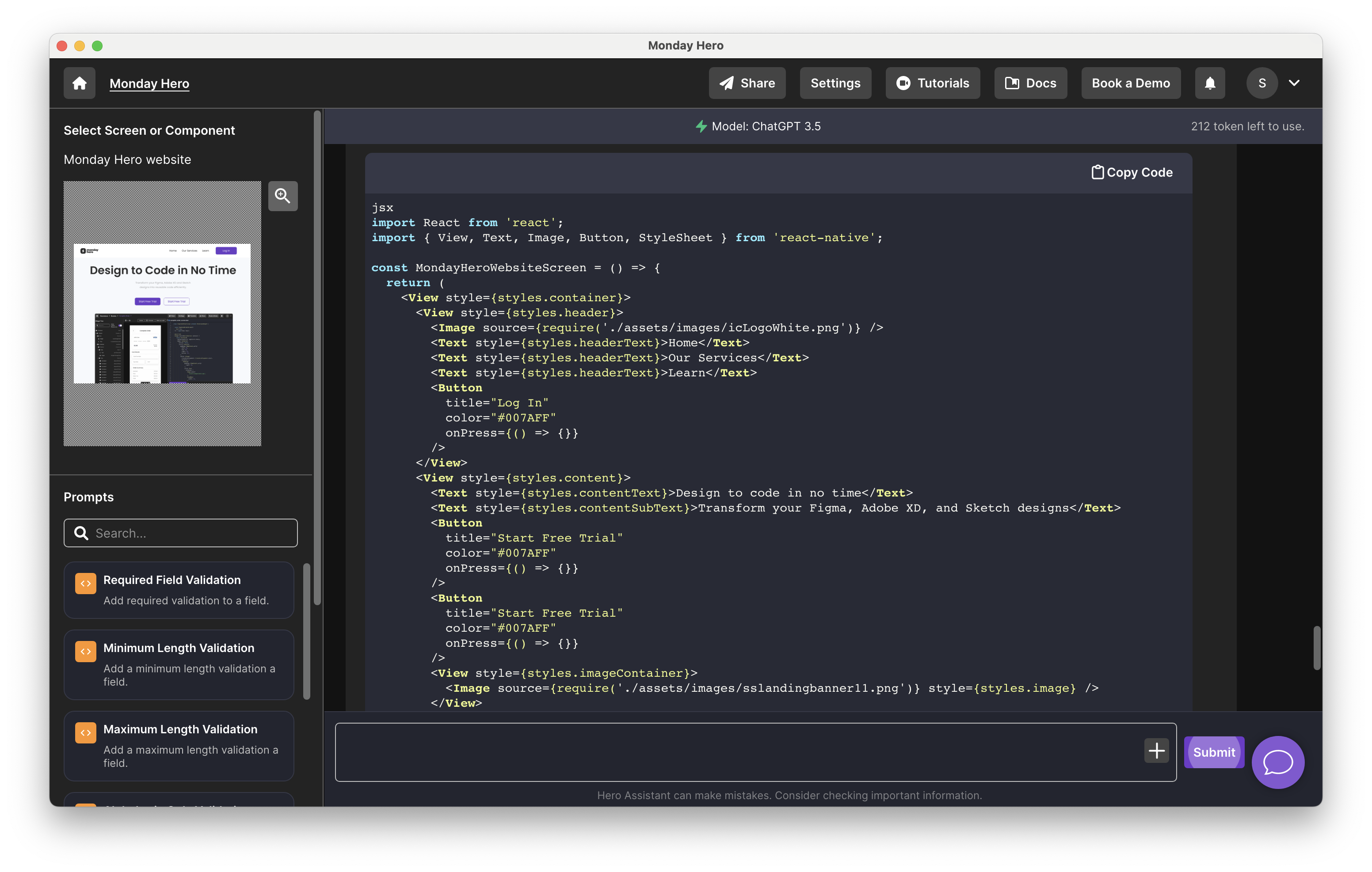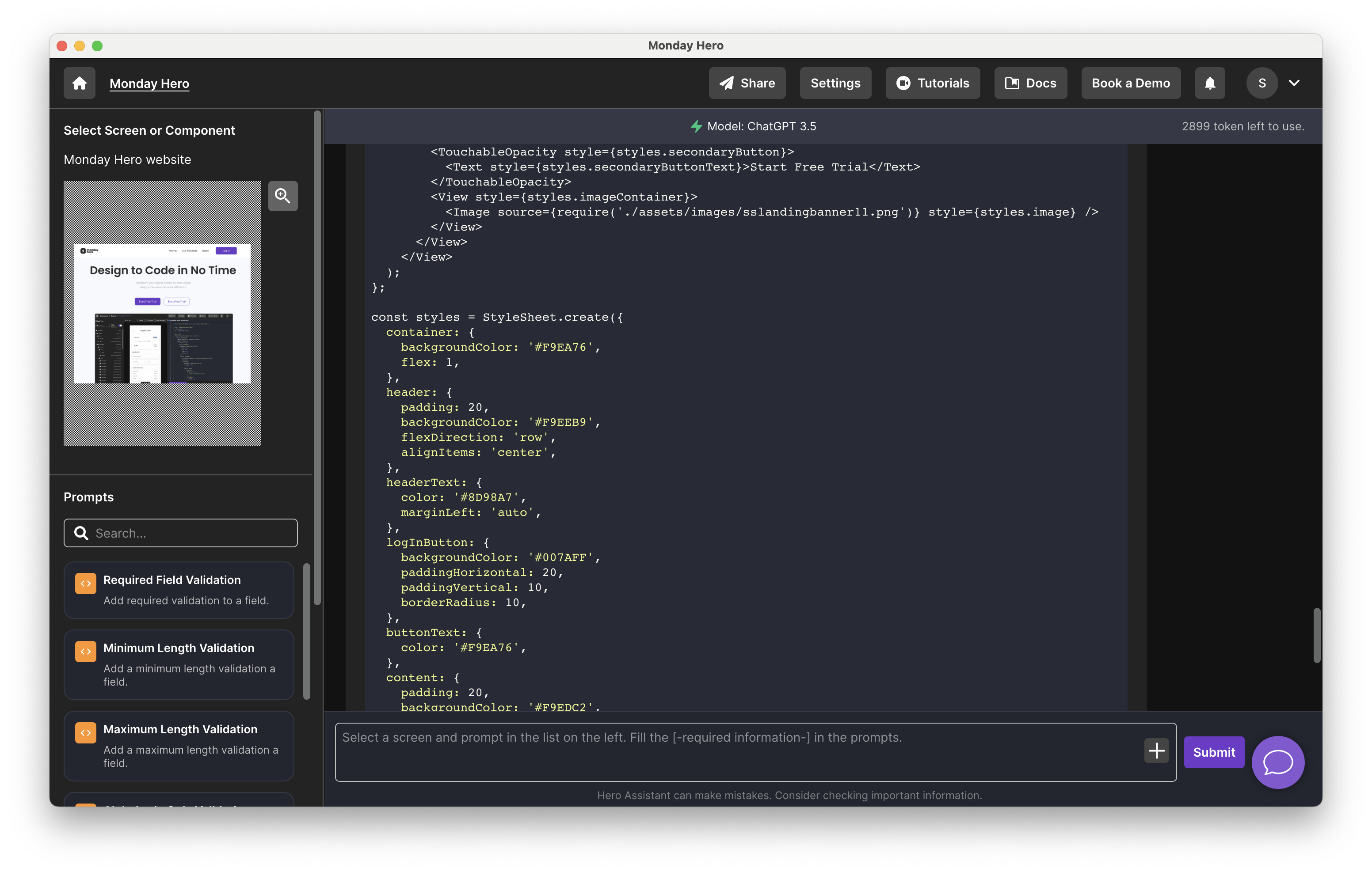 3. [Upload](https://learn.mondayhero.io/getting-started/import-design-files-into-monday-hero) designs to your project. Please make sure the designs are revised to[ get the best code results](https://learn.mondayhero.io/getting-started/design-handoff-to-ios-android-developer) on Monday Hero.